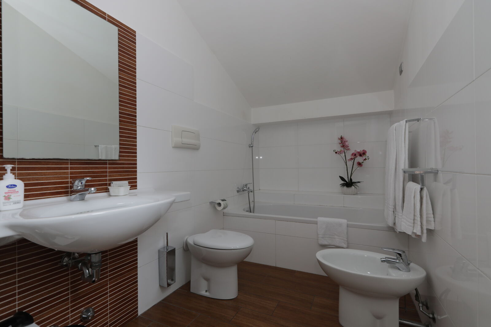 Appartamento da 120 metri quadri composta da soggiorno spazioso arredato con divano letto da una piazza e mezza ed un letto singolo, TV smart da 32" ed una cucina attrezzata con Frigorifero, lavastoviglie, forno ,piano cottura e micronde L'appartamento e' dotato di 2 bagni il primo con doccia e il secondo con vasca. Ampio terrazzo La zona notte comprende 2 camere da letto una con letto matrimoniale e l'altra con 2 letti singoli. Ampi terrazzi che danno sui giardini della struttura.