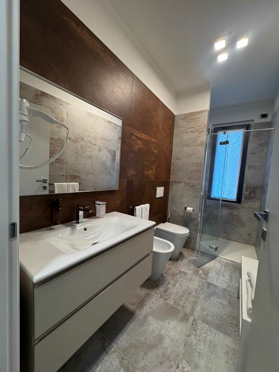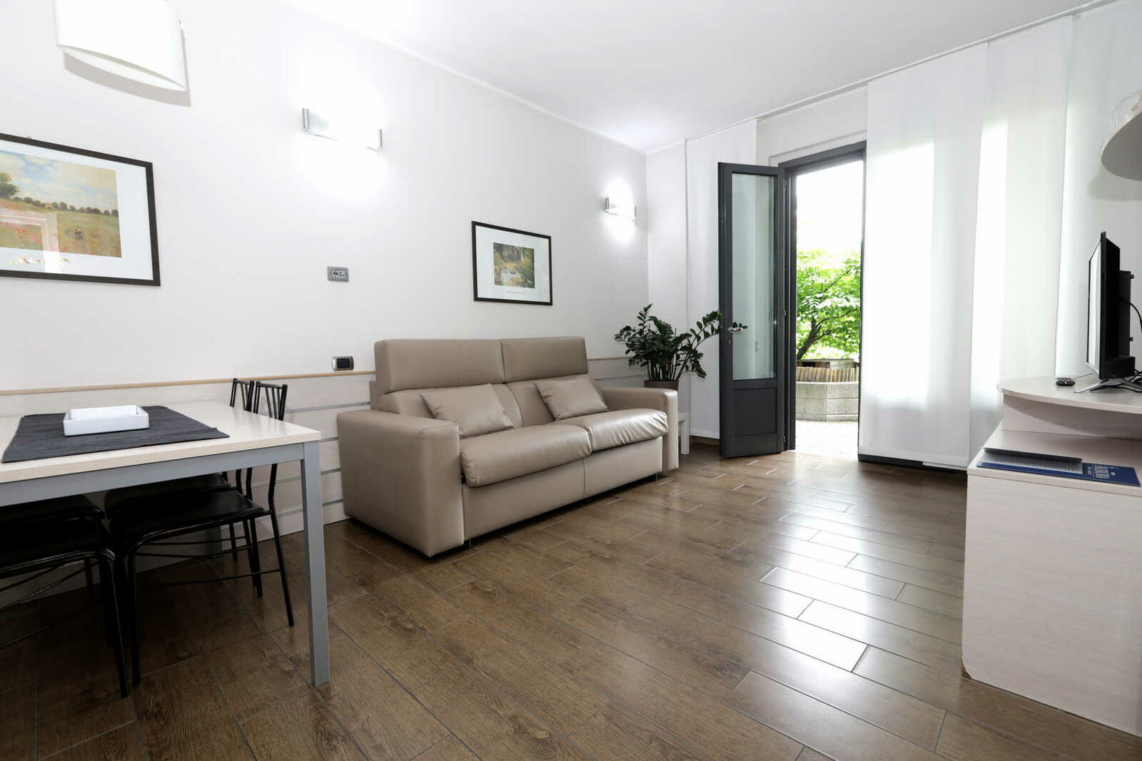 Appartamento piano terra per 2/3 persone con soggiorno cucina e divano. Camera da letto con 2 letti singoli/matrimoniale situata al piano terra vista giardino